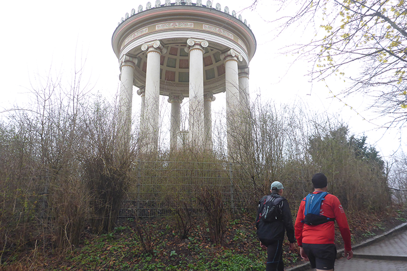 Im Hofgarten passieren wir die Bayerische Staatskanzlei und wenig später erreichen wir den Eingang in den Englischen Garten und schon sind wir am Monopterus, wo wir eine erste, leicht erhöhte Aussicht über München genießen können. Der Tempel im griechischen Stil liegt auf einem künstlichen 16 Meter hohen Hügel.