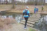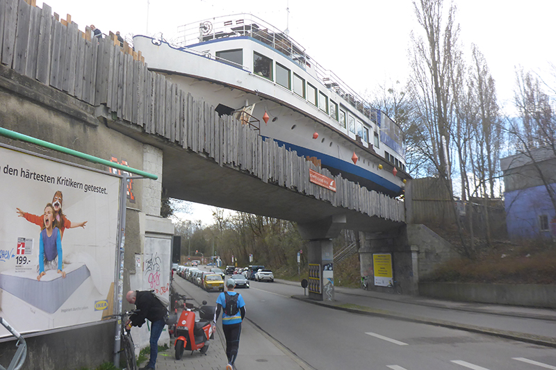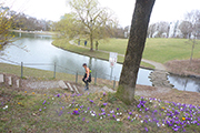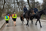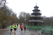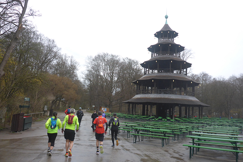 Der Biergarten vor dem Chinesischen Turm, einer der größten in München, hat um die Jahreszeit noch nicht geöffnet. Die originale Pagode ist 25 m hoch und wurde 1792 eröffnet. Damals diente er als Aussichtsplattform, heute sind die umliegenden Bäume aber viel zu hoch und er ist auch aus Sicherheitsgründen schon länger geschlossen. Nur die Musiker der Blaskapellen dürfen noch hinauf. Gegen Ende des zweiten Weltkrieges (1944) brannte die Turmkonstruktion nach einem Bombenabwurf ab. Neu aufgebaut wurde er wieder 1951. Etwa 3,5 km laufen wir durch den Englischen Garten, gut gesichert von der Reiterstaffel der Polizei, die hier für Ordnung sorgt.