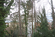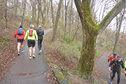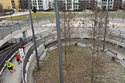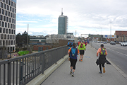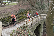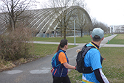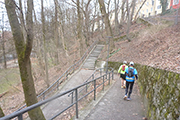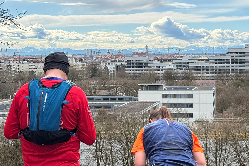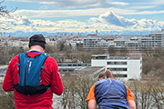 Nach gut 10 km erreichen wir den Luitpoldpark in Schwabing, hier wartet der nächste Aufstieg auf uns. In Serpentinen hiken wir den Luitpoldhügel hoch, der nach dem Zweiten Weltkrieg aus den zerbombten Überresten der Stadt errichtet wurde. Trotz des stark bewölkten Wetters bekommen wir eine tolle Aussicht auf die Alpengipfel geboten.