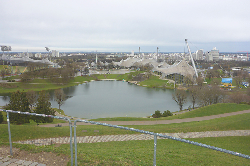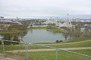 Einen Kilometer weiter wartet schon unsere nächste Bergtour, über einen Kilometer zieht sich der Martin-Luther-King-Weg auf den Gipfel des Olympiabergs. Als eine der höchsten Erhebungen von München (565 m) bietet er wieder einen herrlichen Ausblick auf die Alpen und über das gesamte Olympiagelände, sogar direkt ins Olympiastadion kann man hineinschauen. Daher sind die Plätze hier auf dem Berg bei großen Konzerten fast so begehrt wie Konzertkarten und sogar kostenlos. Was mir auch gut gefällt, am Himmel tun sich jetzt im Westen bereits einige große blaue Wolkenlücken auf, was Hoffnung macht, vor weiteren Regenfällen verschont zu bleiben.