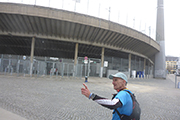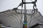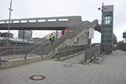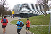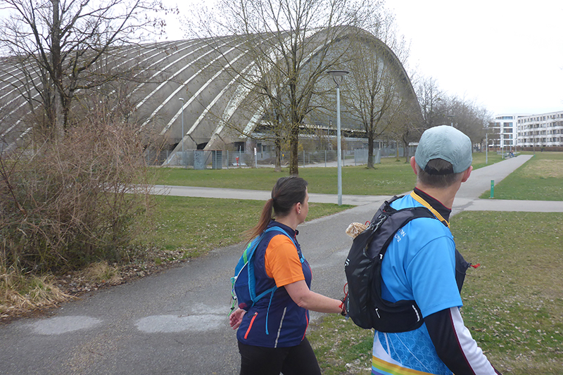 Wir laufen runter vom Berg und direkt am altehrwürdigen Olympiastadion vorbei, das demnächst auch saniert wird und wenig später am futuristischen SAP Garden, der Spielstätte des EHC München und der Basketballer des FC Bayern. Die Eisfläche der Eishockey-Cracks kann binnen sechs Stunden in ein Parkett umgebaut werden.