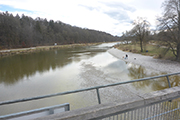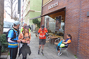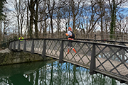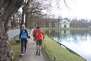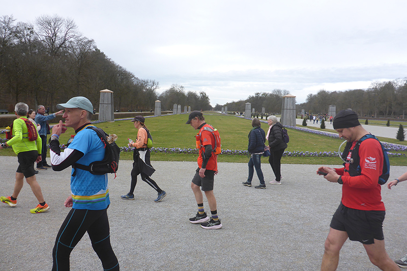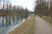 Nach 16 km erreichen wir die Nördliche Auffahrtsallee zu Schluss Nymphenburg. Bis zum Schlosseingang geht es zwei Kilometer am Kanal entlang. Hier wird es natürlich immer voller, über 300.000 Besucher*innen zieht es jedes Jahr nach Nymphenburg mit seinen Museen und der wunderschönen Parkanlage, eines der größten und bedeutendsten Gartenkunstwerke Deutschlands. Auch wenn um diese Jahreszeit noch die Figuren, Ziervasen und die Kaskade abgedeckt sind. In den Toiletten am Schlosseingang gibt es die Möglichkeit die Wasserflaschen aufzufüllen, was einige nützen. Zum Trinken habe ich genügend dabei, ich verspüre momentan eher einen gesteigerten Appetit, eine salzige Breze wäre nach meinem Gusto. Andreas meint: kurz nach der Parkanlage, in wenigen Kilometern liegen Backstuben am Wegesrand. |