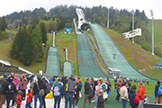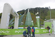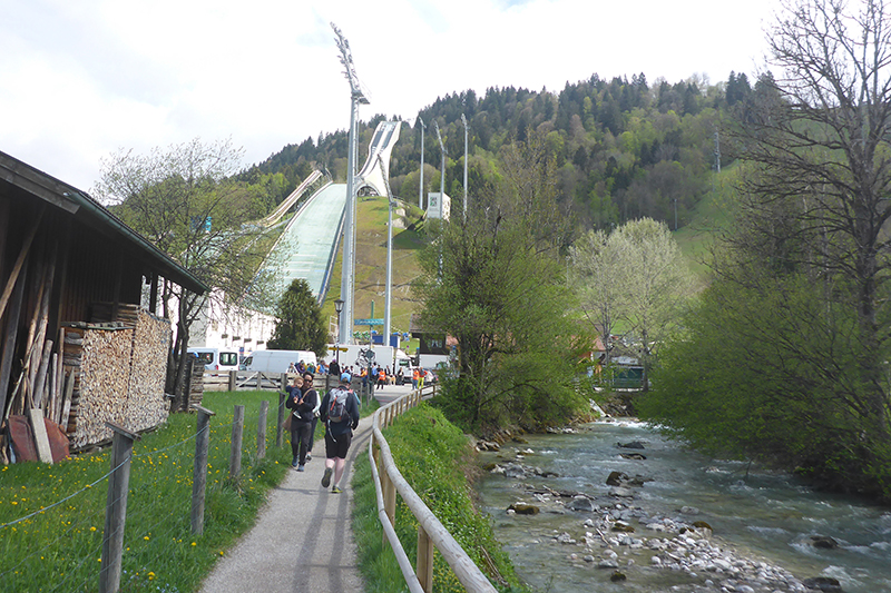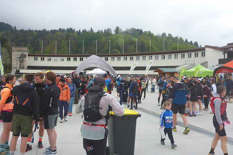 Bedingt durch die Langschläferfreundliche Startzeit von 11 Uhr, kann ich bequem direkt zum Start anreisen, wodurch mir natürlich leider das Spektakel am Gudiberg am Vorabend entgeht. Startpunkt für alle Läufe ist auch heuer wieder im Olympia-Skistadion von 1940 in Garmisch-Partenkirchen (die Spiele fanden allerdings nicht statt), direkt unterhalb der Schanzenanlage. Hier gibt es auch einen großen Parkplatz, aber für die große Menge an Teilnehmerinnen und Teilnehmer sowie vermutlich auch vielen Touristen, wird es hier bereits gut eine Stunde vor den Starts der Trailrunning-Wettbewerbe verdammt eng. Das war im Vorjahr noch nicht so extrem der Fall. Alternativ stehen noch Parkplätze am Olympia-Eisstadion zur Verfügung, wo auch ein Buspendelverkehr eingerichtet ist, oder man nimmt einen ca. halbstündigen Fußmarsch auf sich.