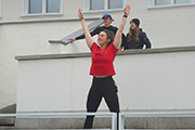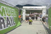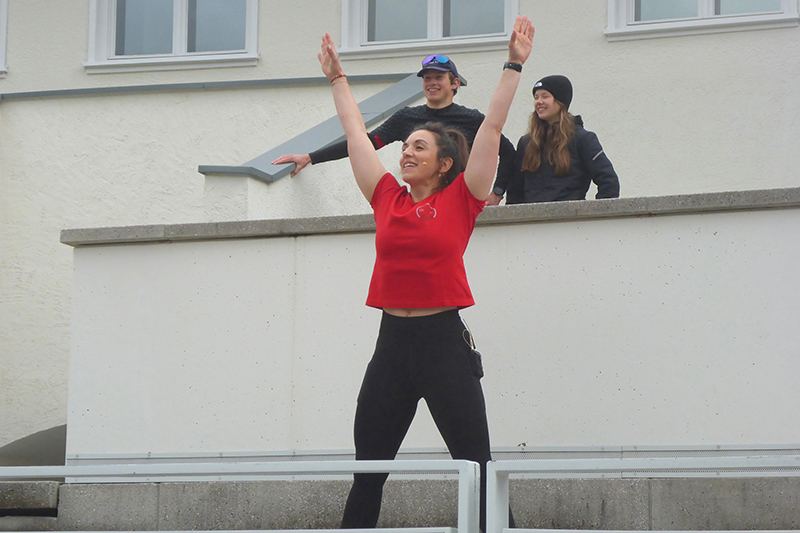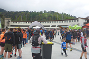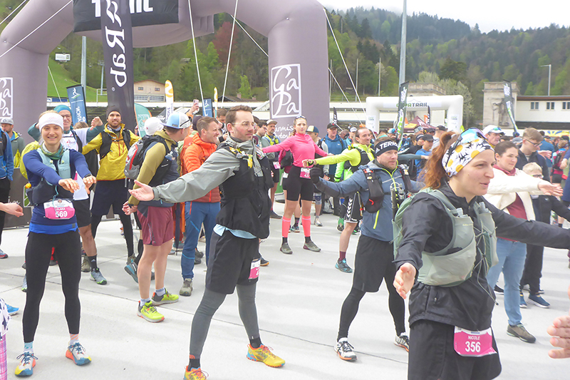 Für Sportler*innen und Zuschauer*innen gibt es dafür viel Platz im Innenraum des Stadions. Neben einigen Ständen der kleinen Expo, ist so auch Raum für Aufwärmgymnastik. Jeweils 20 Minuten vor den einzelnen Trailrunning-Starts findet immer ein Warm-Up statt. Die Trainerin steht auf der Tribüne und gibt uns Anweisungen, was vom Fußvolk auch gut angenommen wird.