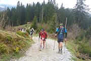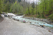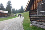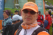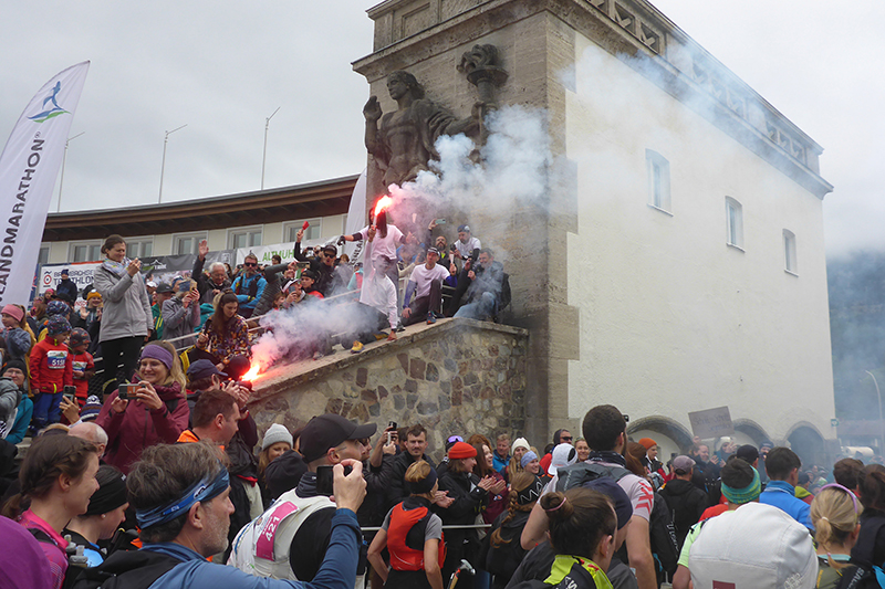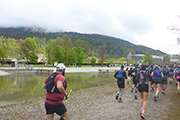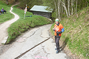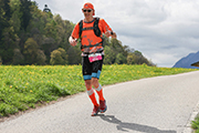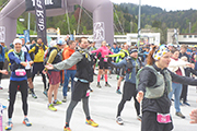 Leicht aufwärts führt uns der Begegnungsabschnitt wieder zurück an ihren Anfangspunkt, den eine Gruppe der Bergwacht kontrolliert. Jeder zurückkommende wird mit einer La-Ola-Welle begrüßt. Auf den nächsten zweieinhalb Kilometern können wir einen Zahn zulegen, eine komfortable Schotterstraße führt meist leicht abwärts. Erst kurz bevor sich Lang- und Mittelstrecke wieder vereinen, geht’s erneut bergan.