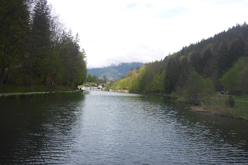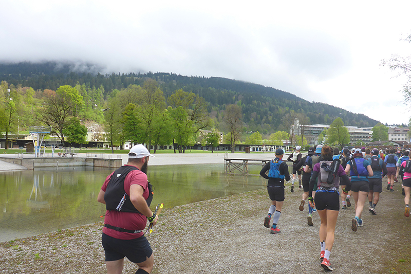 Pünktlich um 11 Uhr wird die Langstrecke gestartet, nach ein paar Glockenschlägen der „Hells Bells“ wird der Start freigegeben. Durch Bengalo-Feuer am Eingangstor verlassen wir das Stadion und schlängeln uns anschließend durch das vollbesetzte Parkplatzgelände. Für uns hat man das Kainzenbad geöffnet, wir laufen am nur schwach gefüllten Naturwasserbecken entlang. Liegt vermutlich gerade an der schon seit längerer Zeit anhaltenden Trockenheit, normalerweise erneuert sich das Wasser ständig durch einen Gebirgsbach.