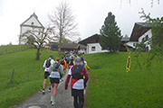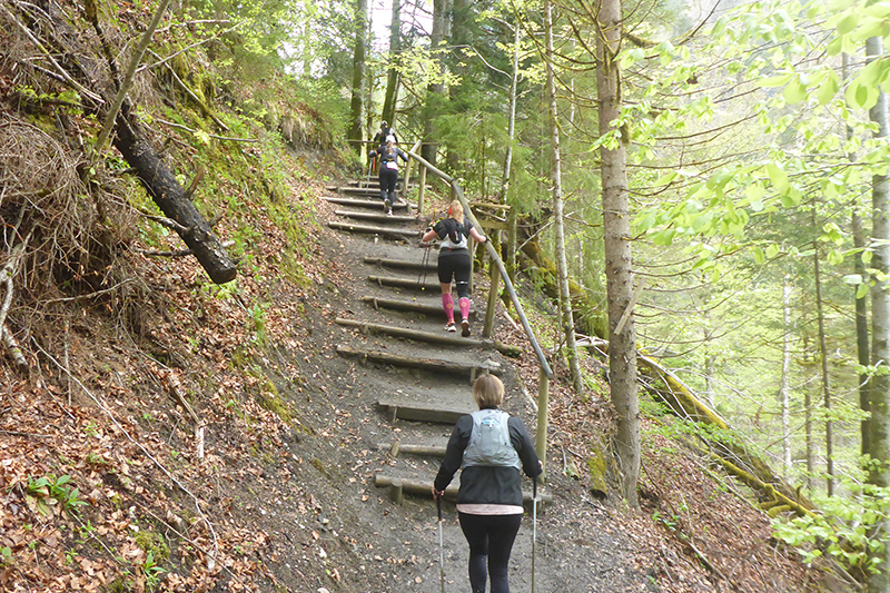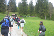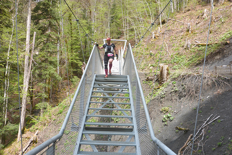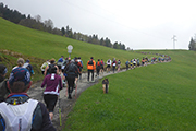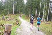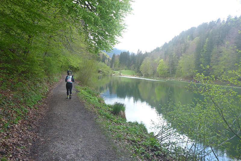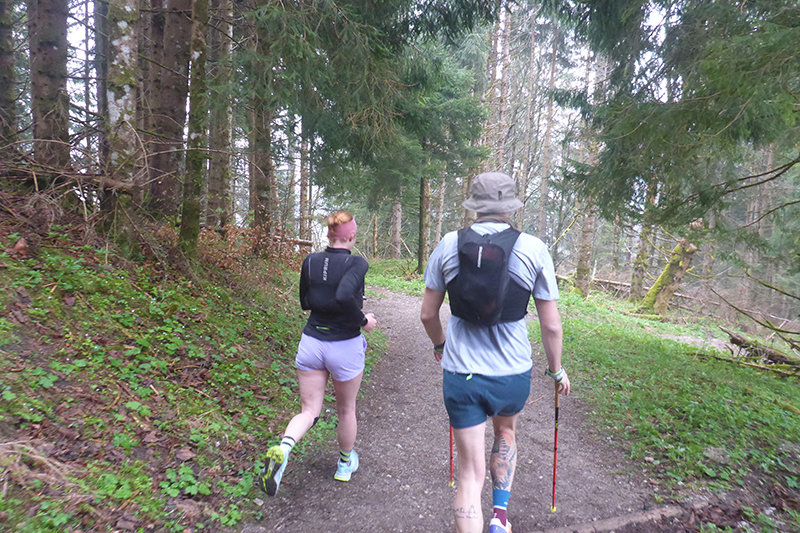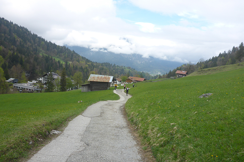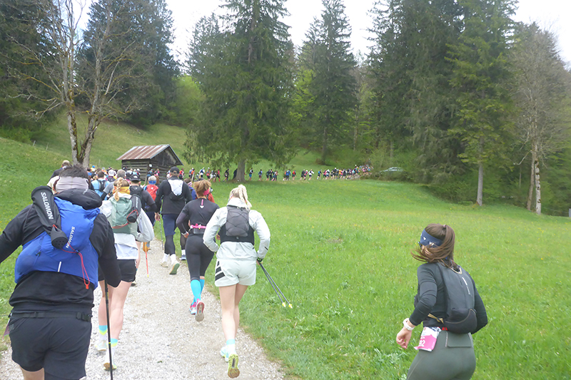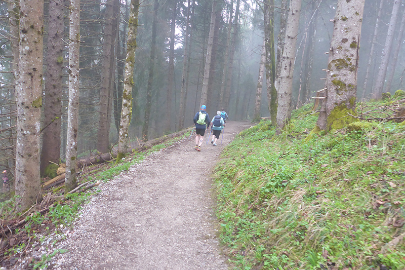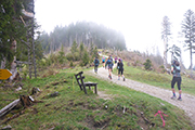 Leider sind die Wolken noch ziemlich dicht, so ist die Aussicht auf die umliegende Bergwelt nur mäßig. Auf einer Motocross-Maschine kommt uns ein Bauer entgegen, mit Filzhut und Heugabel im Anschlag kommt er mir wie ein moderner Ritter vor. Nach 4,2 km erreichen wir die Streckentrennung. Für die Langstreckler*innen geht es noch weiter aufwärts auf den Wamberg. Während die Teilnehmer*innen der Mittelstrecke, die 45 Minuten nach uns starten, direkt nach rechts geleitet werden und unsere anschließende Schleife erspart bleibt.