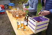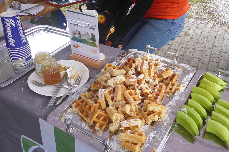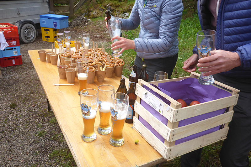 Unsere erste Genussstation – so nennen sich die hier – liegt genau am Ende dieses Abschnitts. Die Ellmauer Alm heißt uns nach 8 km herzlich willkommen, das Verpflegungsangebot – bayrisch zünftig – lässt kaum Wünsche offen. Mein erster Blick fällt auf die Weissbiergläser, stilecht in Glas, da lasse ich mich nicht lange betteln. Dazu noch eine Leberkässemmel im Miniformat, so lässt sich das hier ganz gut aushalten. Es stehen noch weitere Leckereien im Angebot. Gesundheitsbewusste können aber auch zu Apfelschnitzen und Iso oder Wasser greifen. Cola wird auch angeboten.