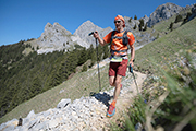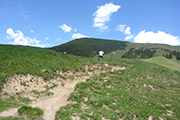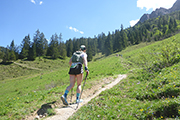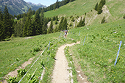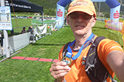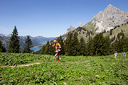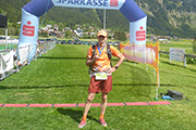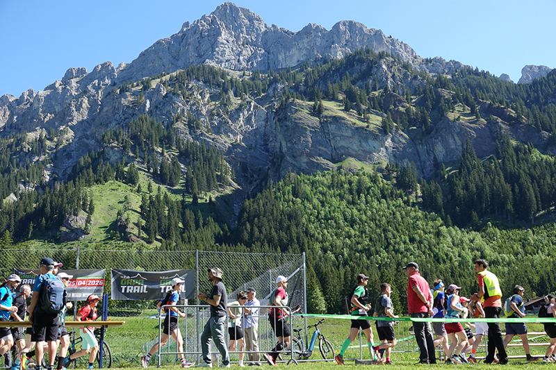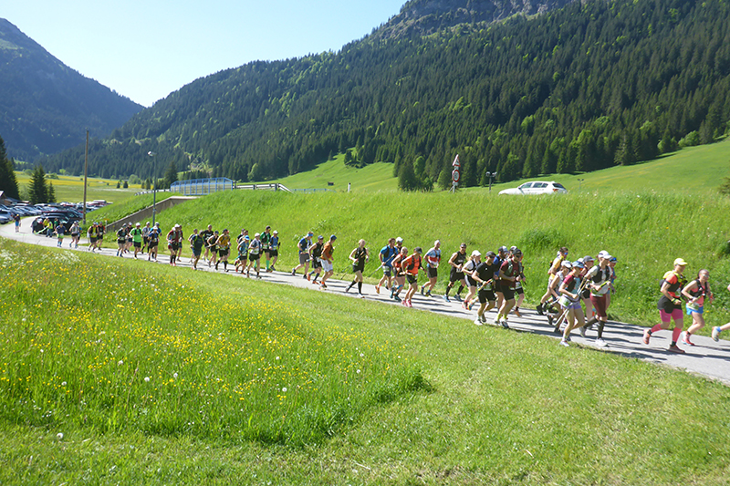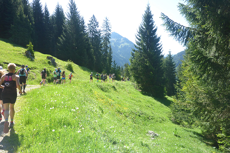 Die ersten die heute an den Start gehen, sind um 10 Uhr die knapp 200 Läuferinnen und Läufer auf dem 6-Hütten-Trail. Vor dem Startbogen wird uns vor den Bergmassiven die Streckenführung recht anschaulich vom Rennleiter erklärt. Ja, da geht’s ganz schön hoch und dazu wird es noch sehr warm werden. Heute gibt es nur tiefblauem Himmel und es sind auch keine Störungen zu erwarten. Mit den Höllenglocken von AC/DC werden wir pünktlich in den Aufstieg geschickt. So muss ich es ausdrücken, denn bereits vom Start weg, geht es leicht aufwärts. Somit entfällt für mich ein erstmal lockeres Einlaufen.