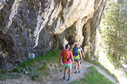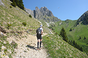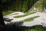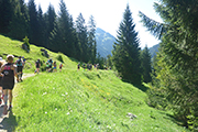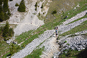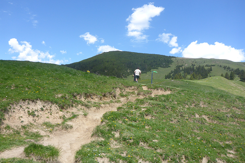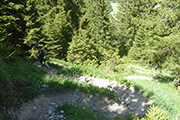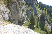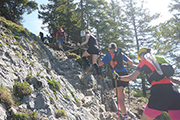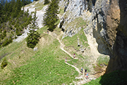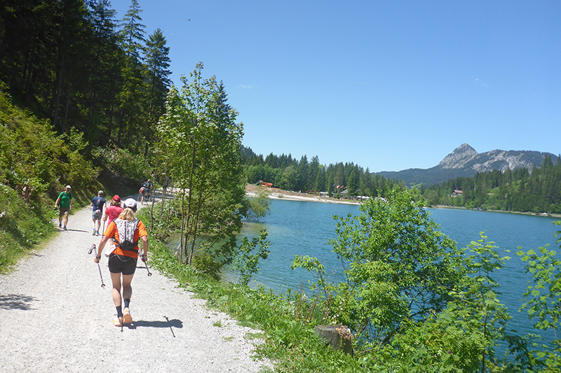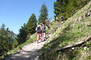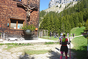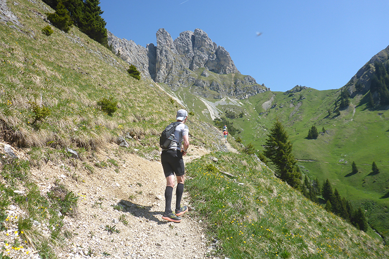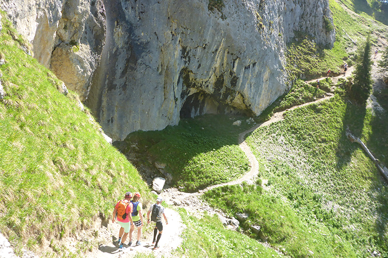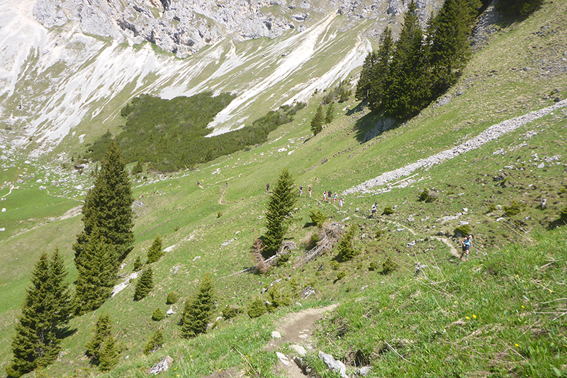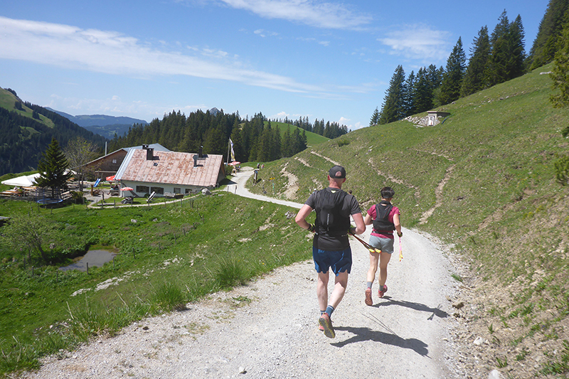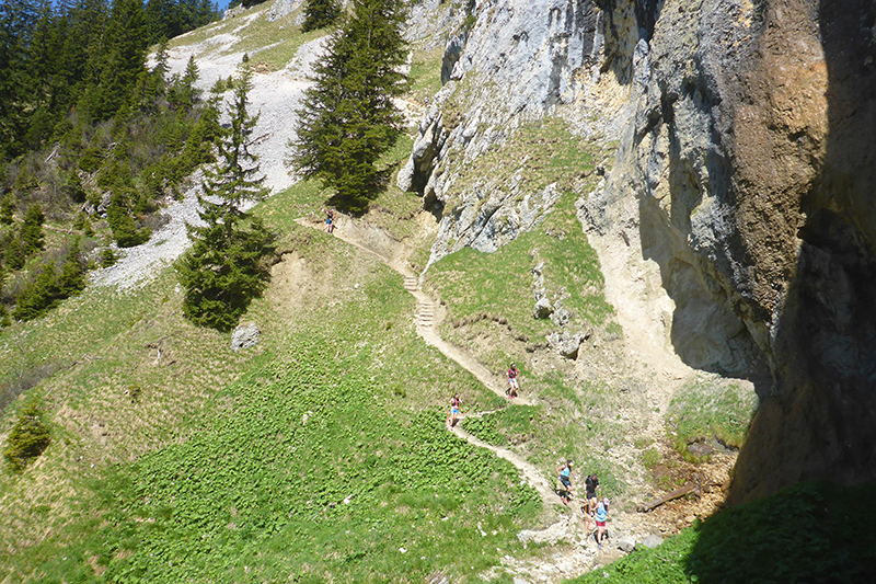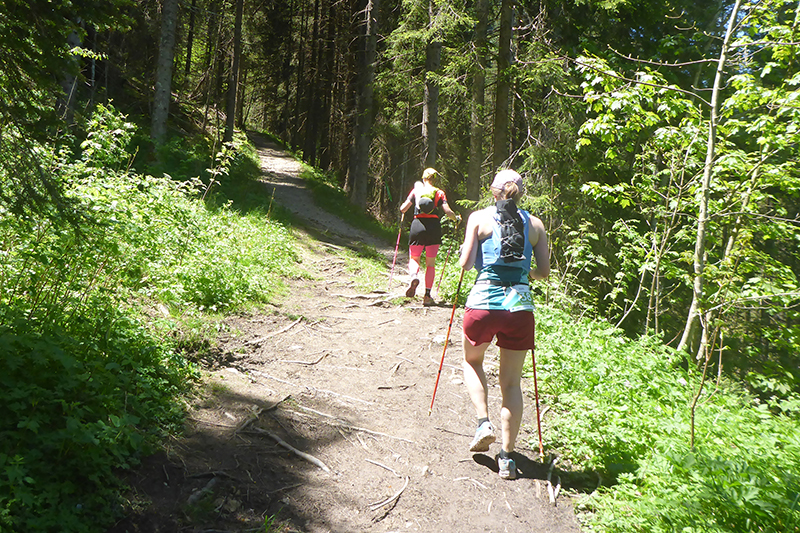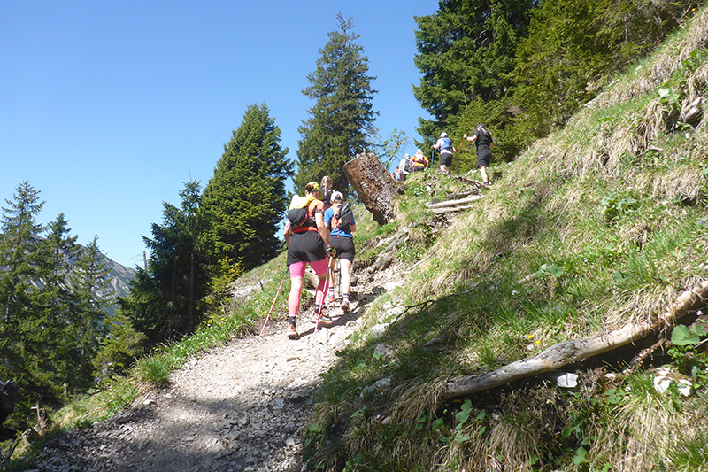 Auf schmalen Sträßchen und Wegen werden wir an das erste Massiv herangeführt. Nach gut einem Kilometer geht es zwischendrin dann aber doch noch für einige hundert Meter leicht abwärts, wo ich besser in einen Laufschritt finde. Eine mit vielen Personen flankierte Spitzkehre schickt uns nach 2,5 km auf einen Serpentinensteig und tief in den Wald. Mit vielen Windungen und oft mit Treppenstufen verstärkt, steigen wir auf bis zum Gimpelhaus, das auf einer kleinen, sonnigen Ebene liegt. Erst kurz unterhalb verlassen wir den dichten Wald und es wird steiniger mit einigen ausgesetzten Stellen auf den letzten Metern.
