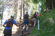 Das Gimpelhaus liegt auf einer Höhe von 1.659 m, wir haben hier 4,1 km auf der Uhr und auch schon über 500 Höhenmeter abgearbeitet. Direkt daneben ist die erste Getränkestation für uns errichtet. Viele wollen bereits Wasser über den Kopf, dem Wunsch kommen die Helfer gerne nach. Iso und Cola werden auch angeboten.