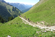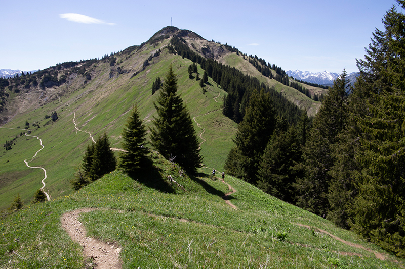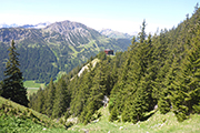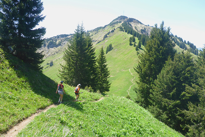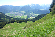 Am Hochjoch erwartet uns ein fantastischer Blick hinunter nach Reute und wenig später erreichen wir unseren höchsten Punkt des Kurses auf knapp 1.800 m Höhe, die Hälfte aller Aufstiegsmeter liegen bereits hinter uns. Etwa 1 km Luftlinie entfernt liegt die Bergstation der Reuter Hahnenkammbahn. Dort bin ich ebenfalls schon viele Male die Pisten im Winter hinunter gewedelt. Da kommen viele Erinnerungen auf. Lang, lang ist’s her... |