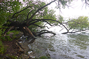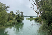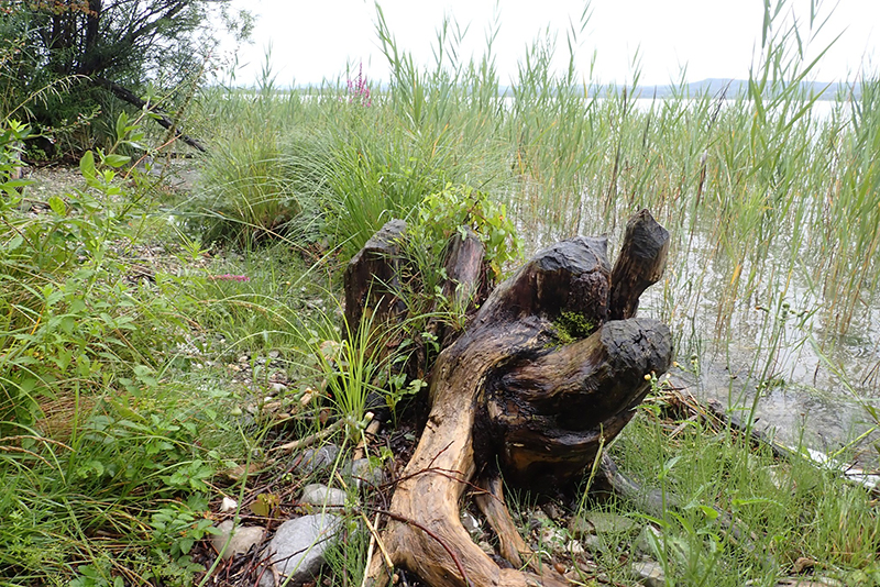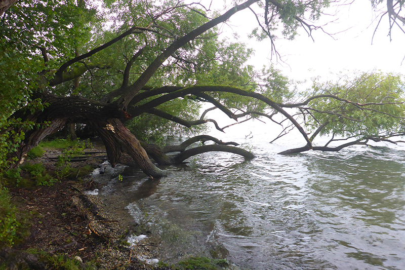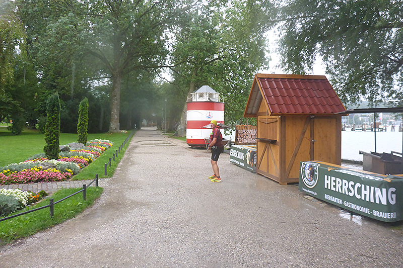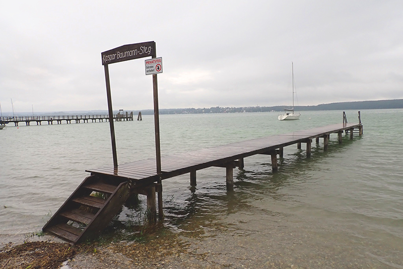 Anfangs sind die Pfade des Uferwegs noch trockenen Fußes zu passieren, aber es wird immer abenteuerlicher. Erste Unterbrechungen fordern kreative Lösungen, man könnte auch sagen kleine Umwege. Die meiste Zeit geht es direkt am Seeufer entlang und wir bekommen viele schöne Ausblicke auf den heute grauen Ammersee geboten, der mit vielen Segelbooten aber gut frequentiert ist. Leider bleibt uns das Alpenpanorama verborgen. 19 Grad Wassertemperatur weist der Ammersee heute auf, Tendenz fallend. Vor vier Wochen war er noch bedeutend wärmer.