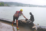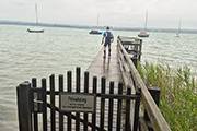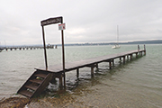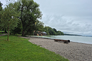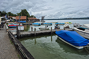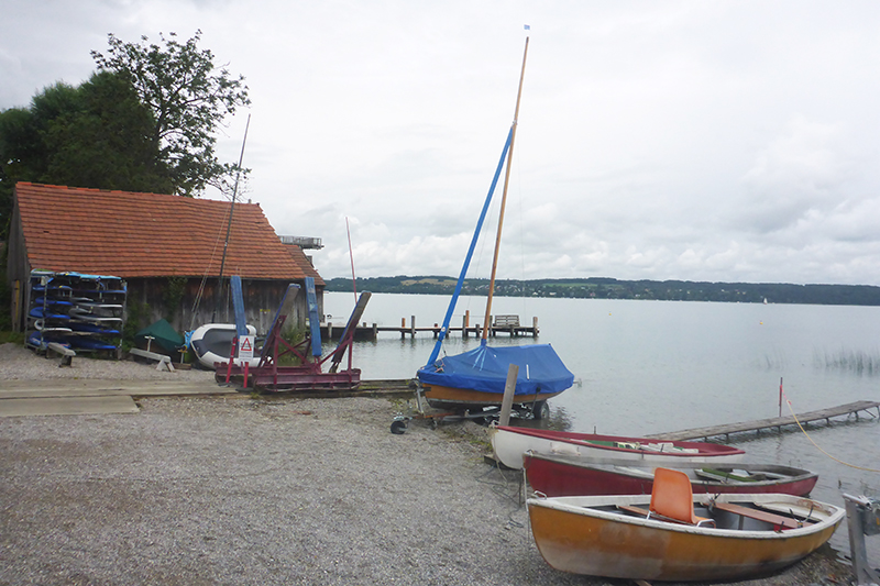 Durchgehend grau präsentiert sich uns der Himmel und hat momentan wenig Einsehen mit unseren Plänen. Um 9 Uhr starten wir bei leichtem Regen unsere Runde. Gleich zu Beginn liegt der schönste, aber auch anspruchsvollste Abschnitt vor uns: der Uferweg nach Herrsching. Nach einem Kilometer auf einem Weg neben dem See, geht es im Wald auf den Siebenbrückerl Weg bis nach Buch, wovon wir einige Überqueren. Aber sieben waren das jetzt sicher nicht. Nach zwei Kilometern führt unser Weg direkt ans Seeufer und damit auch zu den ersten schönen kleinen Kiesbuchten und Bootsstegen.