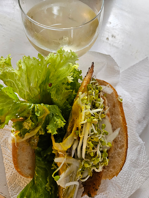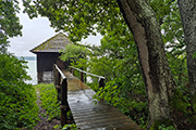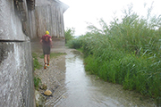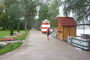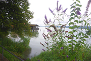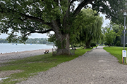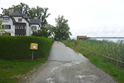 Irgendwann ist es dann so weit, wir kommen auf dem Uferweg nicht mehr weiter, entweder wir waten durchs Wasser oder …ja, oder was eigentlich? Wo es an Land weitergehen könnte, ist nicht einzusehen, so hoch steht das Wasser in dieser kleinen Bucht, die zugleich auch eine Anlegestelle eines Privatgrundstücks ist. Roland, Greppi und ich rätseln. Wir beschließen auf gut Glück über einen schmiedeeisernen Zaun in das Grundstück einzusteigen, uns durch die Boote zu schlängeln und es gegenüberliegend wieder zu verlassen. Das haut hin, einige Meter weiter ist die Fortsetzung des Uferweges tatsächlich auch wieder auszumachen. Raus geht es über das Eingangstor zum See.