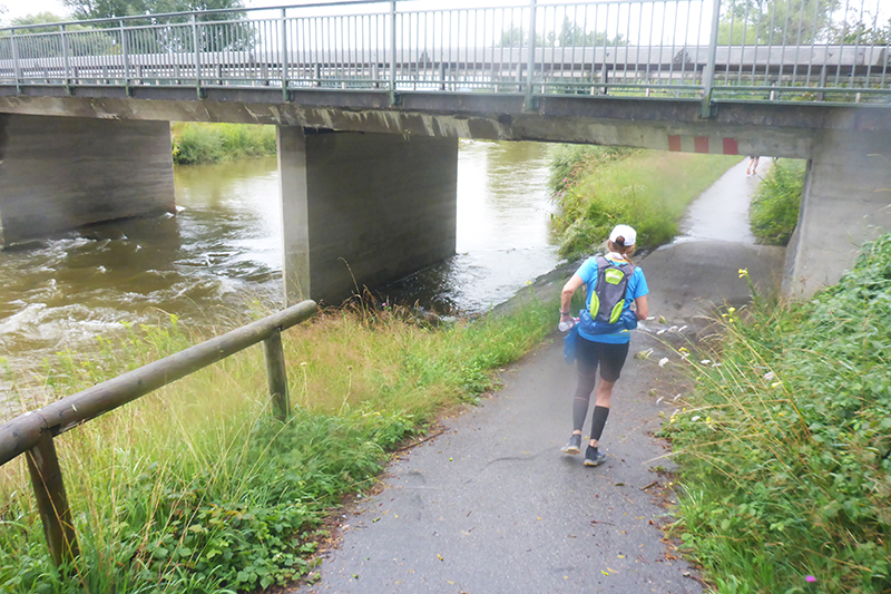 Der Pfad ist nur sehr schmal und somit für Radler nicht geeignet. Was uns natürlich sehr entgegen kommt, darüber hinaus ist das Fahrradfahren hier auch gar nicht erlaubt und bei dem heutigen Wetter sind außer ein paar Hundegängern eh nur wenige unterwegs. Oft geht es jetzt direkt an der Wasserkante entlang, was zur Folge hat, dass wir uns immer mal ganz nah ans Ufergestrüpp drücken müssen, um nicht mit den Schuhen ins Wasser einzutauchen, was nicht immer gelingt. Aber man versucht es halt, solange es geht.