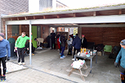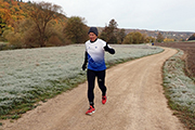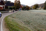 Ich schaue auf den mit Raureif überzogenen Fußballplatz, der verwaist vor mir liegt und mache mir erste Gedanken, ob ich denn auch die richtigen Klamotten eingepackt habe. Ich steige erst mal aus und stelle ziemlich schnell fest, dass es lausig kalt ist und steige daher auch gleich wieder ein. Kurz darauf kommen weitere Läufer, die meinen Eindruck bestätigen. Udo Pitsch parkt ebenfalls ein, auch er ist der Meinung, dass es ziemlich frisch ist. Ich habe Wechselklamotten für die zweite Runde eingepackt. Als ich mich auf den Weg zu Andreas' Carport mache, habe ich alle vier Lagen an. Auch Handschuhe hatte ich in weiser Voraussicht in der Sporttasche, die ich nun im Kofferraum lasse, denn was drin war, habe ich quasi an.