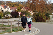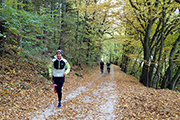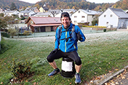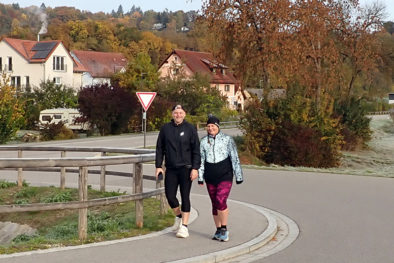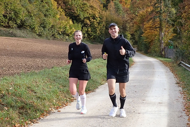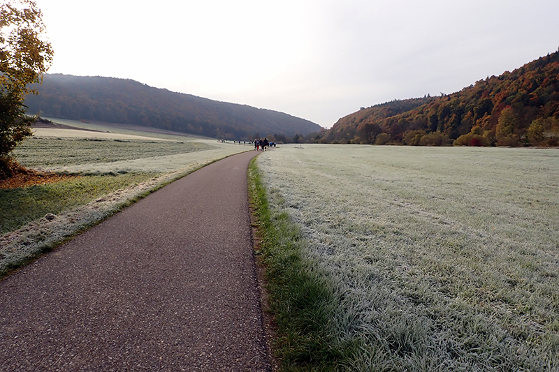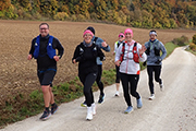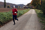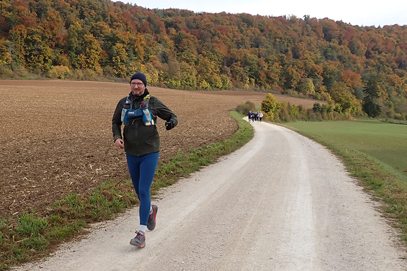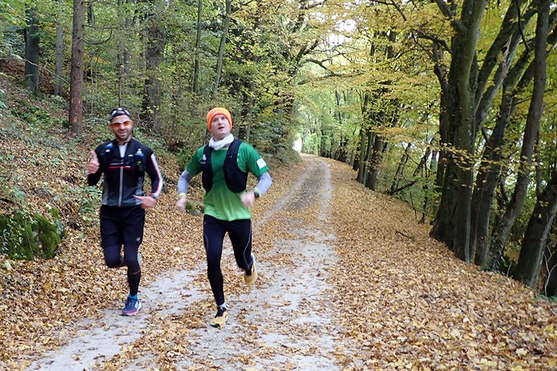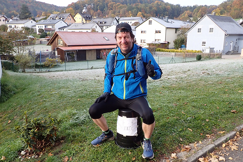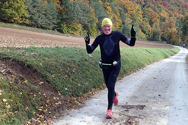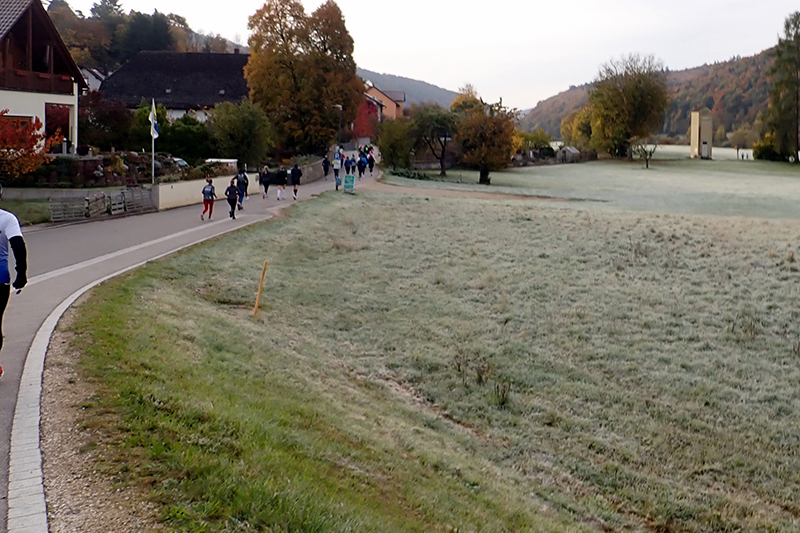 Weiter geht es in Richtung des Weilers Deckelstein. Es gibt über den kleinen Weiler zwei interessante Fakten. Zum einen ist es gut 108 Kilometer von München entfernt und zum anderen ist es gut 397 Kilometer von Berlin entfernt. Für mich heißt das, ich bin nicht mehr weit vom Wendepunkt entfernt. Ich laufe wieder an schönen herbstlichen Wäldern vorbei, teilweise auch hindurch. Natürlich kommen mir auch schon wieder einige Läufer und Läuferinnen entgegen. Man grüßt, winkt. Es macht richtig Spaß. Irgendwann kommt mir auch Udo entgegen. „Gleich da um die Kurve ist der Wendepunkt.“, verkündet er. Ich freue mich, zum einen, dass der Wendepunkt so gut wie erreicht ist, zum anderen, dass Udo gar nicht so weit weg ist.