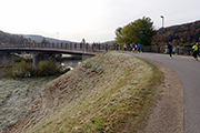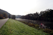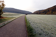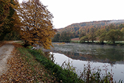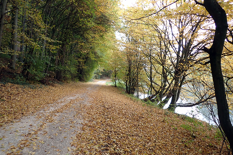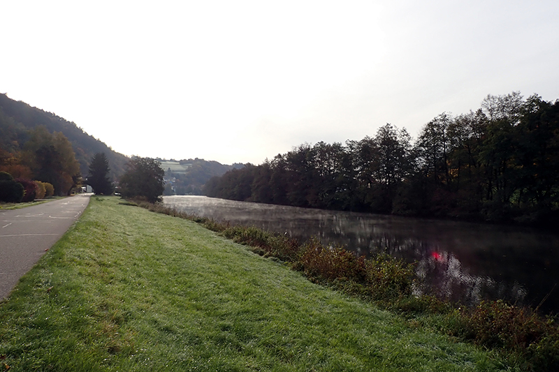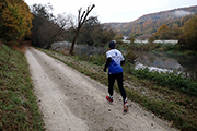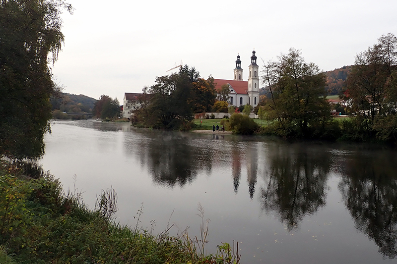 Bunte Herbstwälder auf den Hügeln um uns herum machen das Laufen kurzweilig. Mein Blick wandert auch immer wieder zur Naab. Sie fließt entspannt vor sich hin und ich lasse mich anstecken. Mein Tempo ist auch eher gechillt. Dass Udo hinter mir ist, beruhigt etwas. Nach rund fünf Kilometern erreiche ich Pielenhofen. Die Wadl sind inzwischen warm, meine vier Lagen vertrage ich aber immer noch gut. Auf der anderen Seite der Naab zieht das Kloster Pielenhofen meine Blicke auf sich. Zunächst werde ich aber noch etwas abgelenkt. In Blickrichtung Kloster befindet sich eine kleine Kiesbucht. Dort stehen vier Damen mit einem Kinderwagen. Drei von ihnen waren gerade dabei sich zu entkleiden. Damit nun niemand falsche Bilder im Kopf hat, bei den Badeanzügen ist Schluss. Vielmehr bin ich beeindruckt was anschließend passiert. Ohne zu zögern, waten die drei in die Naab und schwimmen eine Runde. Es hat immer noch Temperaturen um den Gefrierpunkt. Nur gut, dass sie nicht sehen können, dass ich immer noch meine Laufhandschuhe trage.