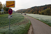 Nach gut einem Kilometer erreiche ich die Ortsmitte von Pielenhofen. Udo ist knapp hinter mir. Er stoppt aber kurz, denn am Straßenrand steht eine Kiste mit Eigenverpflegung. Ich habe meine Getränke im Rucksack dabei. Kurze Zeit später überholt Udo mich dennoch und bietet mir an, dass ich mich auf dem Rückweg gerne an seiner Thermoskanne bedienen kann. Warmer Tee ist dann sicherlich nicht schlecht, denn mein Eistee macht seinem Namen auch alle Ehre. Mit Udo in Sichtweite erreiche ich das Ortsende von Pielenhofen. Das nächste Ziel ist Distelhausen.