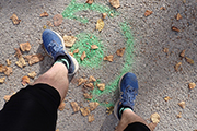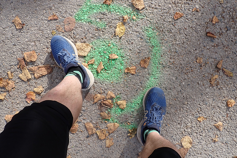 Nun wird es aber langsam Zeit loszulaufen. Der Start ist mit dem ersten der beiden Eimer markiert. Nach einer Ansprache lässt uns Andreas etwas früher auf die Strecke. Diese erklärt er uns Neulingen noch kurz. Bei ihm geht es den Berg runter, dann über die Staatsstraße und über die Brücke. Danach rechts weg, immer an der Naab entlang und nach 10,5 Kilometern am grünen Punkt (dafür braucht's die Farbe) wenden und auf gleicher Strecke zurück zum Carport. Die Strecke laufen die Marathonis zweimal und ich komme mir gerade ziemlich doof vor, habe ich von Andreas zuvor noch um eine GPX-Datei gebeten, damit ich mich nicht verlaufe. Er ist die Strecke extra noch geradelt, um für mich den Weg aufzuzeichnen. Schon etwas peinlich. Aber jetzt habe ich die Datei auf der Uhr und dann nutze ich sie auch.