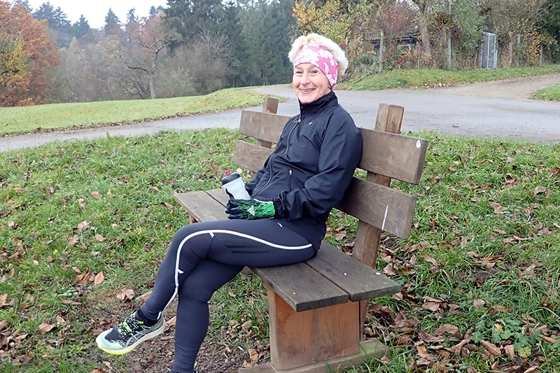 Und dann ist die erste Runde auch schon gleich vorbei. Kati und ich lassen uns in meinem Kofferraum nieder. Die erste Flasche Flötzinger wird geköpft und ich teile sie mit Kati. Sie will wissen, ob ich bei dem Sauwetter wirklich weiterlaufen möchte. Wollen ist jetzt vielleicht nicht das richtige Wort. Eher müssen. Ich war ja im Sommer schon mal hier, da hatte es 35 Grad und ich habe nach der ersten Runde gestreikt. Jetzt hat es acht Grad und es nieselt. Wie oft soll ich noch herfahren, damit das Wetter passt? Also breche ich wieder auf. Die Pause war eh lang genug, so dass mir schon etwas frisch wird. Kati erklärt mir noch kurz, dass sie sich nun in die Badewanne und danach mit einem Buch auf die Couch wirft. Eine Frechheit ist das schon. Mir bleiben noch über drei Stunden im Nieselregen. Ich entferne mich möglichst schnell vom Auto, so dass irgendwann umdrehen keinen Sinn mehr macht. Dabei werde ich auf den ersten Kilometern im Wald noch von Sandra Langguth und René Slavik überholt. Die beiden Spinner waren gestern auch schon am Start. Legen also einen Doppeldecker hin. Und sie grinst auch noch entspannt, als sie an mir vorbeiläuft. Ein paar Worte und weg sind die beiden.