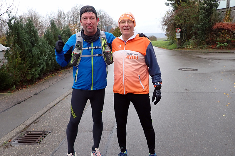 Die gut zweistündige Fahrt verläuft unspektakulär. Klar Sonntag, früh am Morgen. Was soll da schon los sein? Nix! Tempomat rein, zwei Nutella-Brote – denn Semmeln gab es nur die eine – und noch einen Kaffee. Den kann man da bequem und unterwegs in aller Ruhe zu sich nehmen. Um zwanzig vor neun parke ich dann am Ortsrand von Rutesheim gegenüber der Eisengriffhütte auf dem dortigen Parkplatz ein. Es ist noch ruhig. Da das Startfenster zwischen 6 und 12 Uhr liegt, weiß man eigentlich nie, wer und ob schon jemand unterwegs ist. Keule, weniger bekannt als Klaus Neumann ist es jedenfalls noch nicht. Er steht hinter seinem offenen Kofferraumdeckel und feilt noch etwas an seinem Outfit. Unter uns Marathon-Junkies ist Keule klar die Nummer Eins. Über 1.300 Marathons, davon 600 Ultras, das ist schon wirklich eine Hausnummer und dass es auch wirklich so ist, kann man in der Weltrangliste der meistgelaufenen Marathons nachlesen. Auf Platz 19 kann man da den Keule finden. Wir wechseln ein paar Worte über das Wetter, das Alter und dass wir halt auch nicht unbedingt schneller werden. Und dann ist er auch schon weg. Ersatzweise für den Klaus, parkt wenig später die Kati neben mir ein.