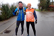 Kati und ich ziehen nach einem kurzen Gespräch weiter. Wir haben noch ein paar Hügel vor uns. Von einem aus haben wir eine gute Sicht auf die Silhouette von Leonberg. Kati erklärt mir diese ganz genau, wo sie wohnt, wo ihre Mutter wohnt und so weiter. Ich war da zwar schon mal, könnte es aber zugegebenermaßen von hier nicht ausmachen. Unsere Runde nähert sich langsam, aber sicher dem Ende zu. Jetzt kommt aber noch der ätzende Teil, wie Kati betont. Ich kann ihr dann auch zustimmen. Über einen Kilometer geht es immer leicht bergauf und dazu ist die Strecke noch schnurgerade, was das alles nicht unbedingt leichter macht. Irgendwie beschleicht mich dann das Gefühl, dass uns jemand folgt. Möglicherweise ist es mein Beschützerinstinkt und ich schau mich mal um. Es naht ein weiterer Läufer, der ohne Zweifel dem RuR zuzuordnen ist. Er kommt mir bekannt vor. Es ist Klaus Mantel, der vor kurzem seinen 250. Marathon gelaufen ist und somit eindeutig auch den Marathon-Junkies zuzuordnen ist. Wir begrüßen uns und er und Kati verfallen in ein Gespräch, dem ich nicht wirklich folgen kann. Das Schwäbisch wird nun in seiner reinsten Form artikuliert und der Klaus hat eine noch höhere Schlagzahl an Worten als Kati.