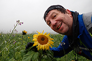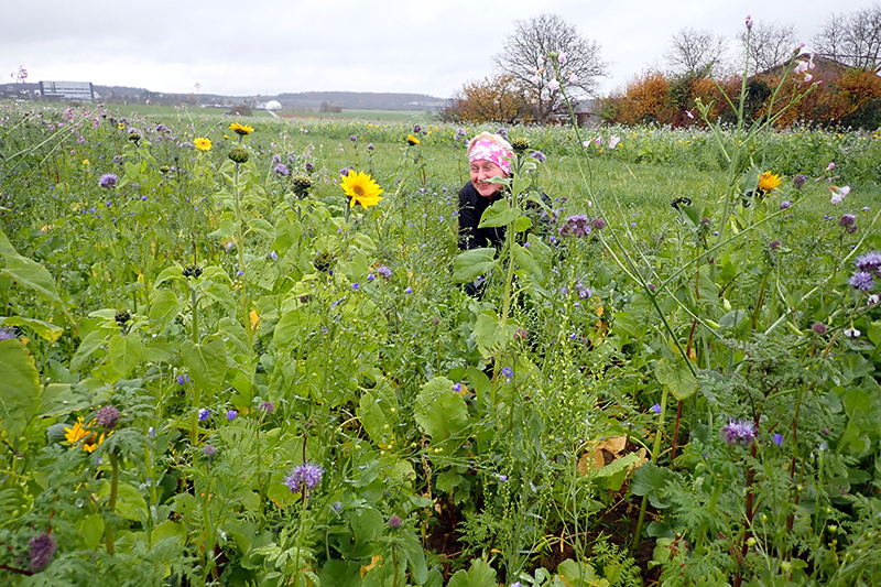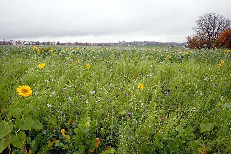 Bis wir Rutesheim wieder erreichen, gibt es noch viel Natur, zwischen der es hindurchzulaufen gilt. An einem Gewächshaus mitten in der Pampa bremst Kati kurz ein. Sie ist gartentechnisch auf einer ganz anderen Ebene als ich und kennt sich da aus. In einem Trog wachsen gelbe Blumen, das kann ich gerade noch erkennen. Kati erklärt mir wie sie heißen, was ich mangels botanischen Interesses im nächsten Moment schon wieder vergessen habe. Sie sind essbar und wirken entzündungshemmend. Da mich seit ein paar Tagen schon eine Entzündung plagt, höre ich etwas aufmerksamer zu. Die Entzündung befindet sich immerhin in einer doch laufrelevanten Körperregion, weil sie rein anatomisch gesehen die beiden Haxn zusammenhaltet. So lasse ich mich dazu hinreißen, mir eine Blüte in den Mund zu schieben. Schmeckt nach nix, ist aber ganz schön scharf und einfach nicht mein Ding. Soweit möglich spotze ich die zerkauten Blätter wieder aus und spüle ordentlich mit Apfelsaftschorle nach.