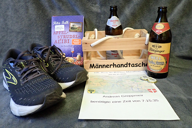 Da hätte ich doch glatt die Zielverpflegung vergessen. Also ab in den Keller und die hölzerne Herrenhandtasche bereitgestellt. Zwei Flaschen stilles Wasser, eine kleine Flasche Multi und dann noch – klar – zwei Flötzinger Hell und noch ein Flötz alkoholfrei. Das ist aber dann eher für die Kati als für mich. Jetzt kann nichts mehr schiefgehen. Ich lese noch zwei oder drei Kapitel. Dann ist Feierabend. Morgen muss ich früh raus. Die Nacht ist kurz. Etwas unruhig auch. Eine typische Nacht vor einem Marathon halt. Eine viertel Stunde bevor der Wecker klingelt, kriech ich schon aus den Federn. Jetzt noch einmal einschlafen wäre fatal. Dann bist Du nämlich wie erschlagen. So kann ich es auch etwas entspannter angehen lassen. Eine Tasse Kaffee, eine Nutella-Semmel und eine Katzenwäsche später sitz ich auch schon im Auto und mach mich auf ins Nachbarbundesland Baden-Württemberg.