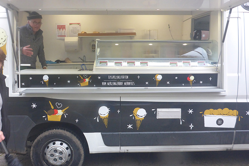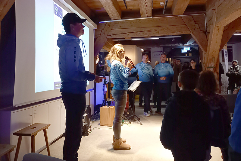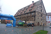 Im Untergeschoß findet um 18 Uhr das Race-Briefing statt. Mit Axel bin ich zu Fuß von unserer Unterkunft hierhergekommen. Natürlich nicht ohne Hintergedanken, wir wollen selbstverständlich auch das vielgepriesene Spalter Bier probieren. Auch für den Hunger ist gesorgt, im Außenbereich befindet sich der Food Court, wo man sich mit fränkischen Spezialitäten stärken kann. Im hinteren Bereich des Untergeschosses, wo das Briefing stattfindet, gibt es gemütliche Tische, dazu spielt ein Duo alte Rockklassiker auf der Quetsche und Percussion. Auch in Verbindung mit dem wirklich süffigen Bier lässt sich hier gut aushalten. Bis auf eine kurzfristige Streckenänderung, gibt es dann beim Briefing nur wenige Neuigkeiten, was uns eh nicht schon per Mail mitgeteilt wurde. Aber natürlich können auch Fragen gestellt werden, zu speziellen Themen.