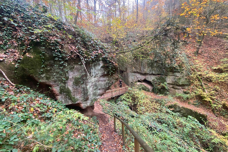 Über den Rücken des Galgenbergs führt unsere Strecke nach 3 km zum Schnittlinger Loch, einem ersten Höhepunkt unseres Kurses, wenn man mal von der ganzen Bierlandschaft absieht. Nein, im Ernst, wunderschön geht es durch die wildromantische Schlucht, die auch vom Bayerischen Landesamt für Umwelt als Naturdenkmal erfasst und als Geotop ausgewiesen ist. Fotografisch kann ich das heute leider nicht so festhalten, wie es die Schlucht verdient hätte. Meiner Kamera behagt das dunkle und feuchte Wetter leider überhaupt nicht, so dass ich nur ein paar vorzeigbare Bilder aufweisen kann, die mir zum Teil auch noch von Roland zur Verfügung gestellt wurden. Das Loch ist entstanden durch Unterwaschungen und Unterspülungen. Die Halbhöhlen und Felsabstürze mit einer Höhe von bis zu 15 m erstrecken sich über eine Länge von etwa 50 m. Zuerst geht es für uns kurz runter, über eine Brücke und direkt im Anschluss dürfen wir unter einer überhängenden Felswand wieder aufwärts klettern. Wirklich großartig.