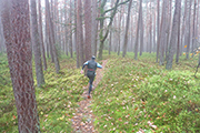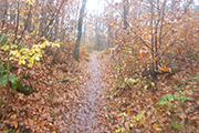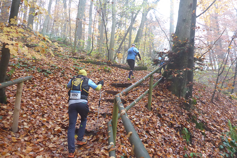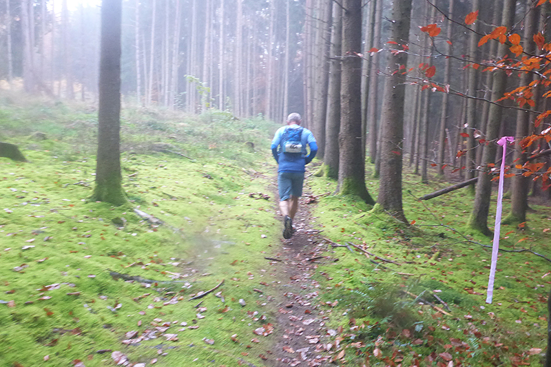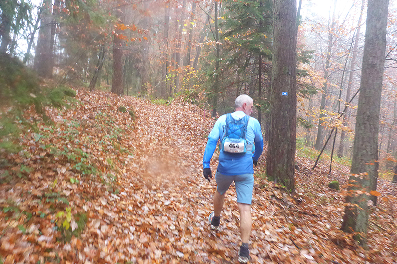 Auf Asphalt geht es wieder raus aus dem Ort und abwärts in den Wald hinein. Mittlerweile habe ich durch beschlagene und nasse Gläser nur noch eingeschränkte Sicht und so rausche ich an einer Abzweigung vorbei. Zum Glück werde ich schnell von einem Mitläufer wieder zurückkommandiert, was mir im Anschluss noch zwei weitere Male, zum Glück immer nur für kurze Abschnitte passiert. Mit meiner Brille bin ich heute wirklich beeinträchtigt, obwohl ich sie auch hin und wieder versuche trocken zu wischen. Etwa zwei Kilometer geht es immer leicht abwärts, wir wechseln des Öfteren Richtung und Terrain zwischen Trails, Wegen und Forststraßen. Die sind natürlich besonders gut zu laufen. Leider bin ich dadurch wieder einmal nicht auf die Streckenmarkierungen fixiert. Aber Karl hinter mir kennt sich aus und pfeift mich zurück. Erneute 200 Meter Umweg sind noch zu verschmerzen.