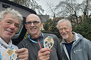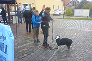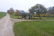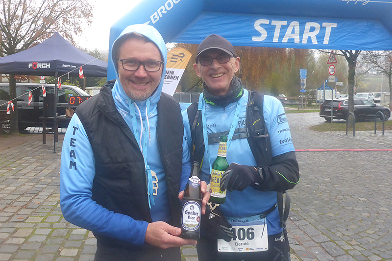 Wettermäßig hat sich leider in der Nacht auch einiges getan. Die Nebelglocke hat sich aufgelöst, dafür sind dichte Wolken aufgezogen, die auch immer wieder Regen mit sich bringen können. Aber immerhin, ist die Temperatur dafür etwas gestiegen. So 7 bis 8 Grad C sind zu erwarten. Viele am Start haben auch wirklich das Läufershirt an, es steht sinnbildlich für die Unterstützung, die man von den drei Partnern erhält. Aber dem Wetter geschuldet, zieht es auch ein Teil vor, mit Regenjacke zu laufen, obwohl es derzeit gerade nicht regnet. Übrig geblieben von 100 Angemeldeten, sind heute noch 8 Frauen und 74 Männer, da haben es wohl einige vorgezogen, bei dem nasskalten Wetter zu Hause zu bleiben.