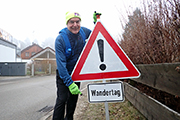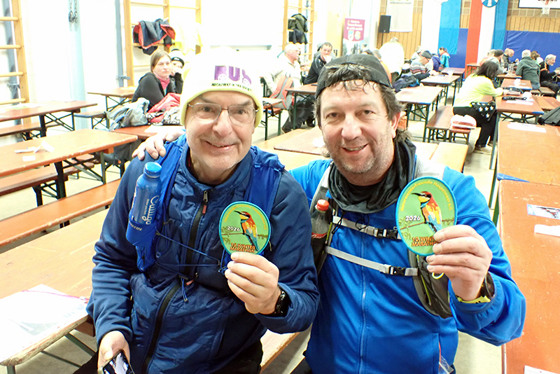 Jürgen und ich treffen uns um halb acht in der Hattenhofener Turnhalle. Wie schon in den Jahren zuvor ist hier die Anmeldung, die Urkundenausgabe, es gibt Verpflegung vor und nach der Wanderung und einen warmen Platz, der nach unserem Lauf zum Verweilen einlädt. Jürgen ist fasziniert. Ihm war nicht bewusst, dass es eine derart große Wanderszene gibt und dass die Wanderer teilweise lange Anfahrten auf sich nehmen. Naja, es ist eigentlich genauso wie bei uns Marathonläufern. Wer von uns ist nicht schon mal mehrere hundert Kilometer für einen Marathon gefahren? Das ist hier nichts anderes. Jürgen ist auch von den Aufnähern begeistert, die es für alle Marathonis gibt. So einen muss er auch haben.