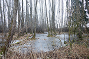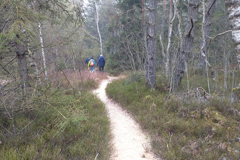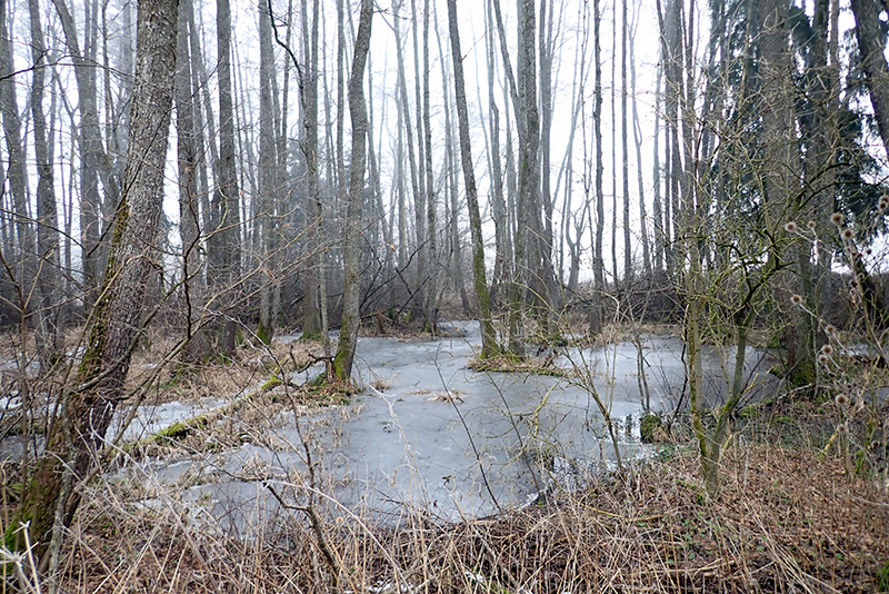 Die Strecke ist in diesem Jahr komplett überarbeitet und so geht es zunächst auf eine kleine Westschleife. Wir laufen grob in Richtung Hörbach und Althegnenberg. Immer wieder sind alte Streckenabschnitte erkennbar. Das Haspelmoor durchlaufen wir heute nur am Rande. Als wir in den Wald im Haspelmoor laufen, stellen wir fest, dass der Pfad mit Eis überzogen ist, aber die Naturwanderfreunde super Arbeit geleistet haben. Das Eis ist mit Sägespänen abgedeckt, so dass es sich ganz angenehm laufen lässt. Wir traben nebeneinanderher und das Tempo ist eher mäßig. Wir schieben das jetzt einfach mal auf den frostigen Untergrund. Dennoch kommen wir gut voran und stehen schon bald an der ersten Verpflegungsstelle. Jürgen bekommt den ersten Wanderstempel in seinem Leben auf seine Kontrollkarte gedrückt und hat das System nun verstanden. Für Verpflegung ist es aber noch etwas zu früh und wir laufen weiter.