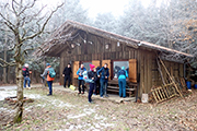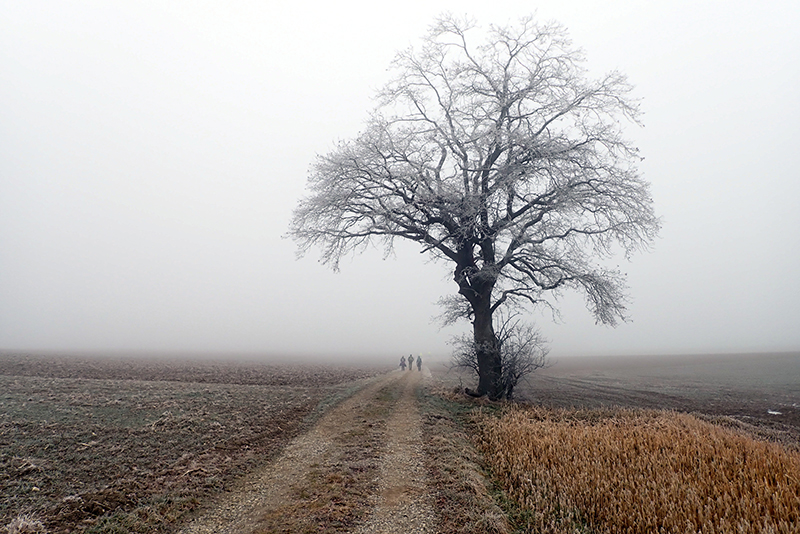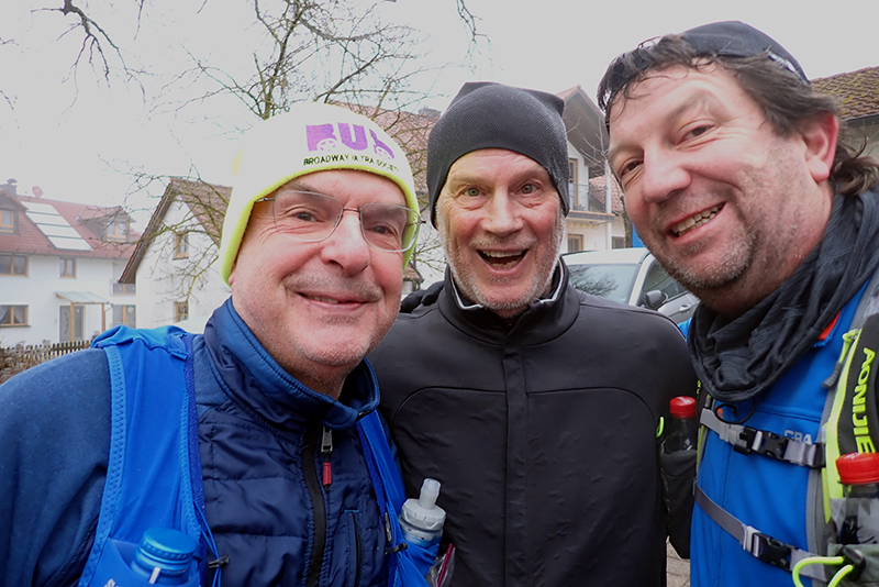 Wir erreichen Althegnenberg als westlichsten Punkt unseres Marathons und laufen nun wieder über Feld- und Waldwege zurück nach Hattenhofen. In den Wäldern ist die Strecke teilweise spiegelglatt und Jürgen weist mich an diesen Stellen gerne darauf hin, dass ihm irgendjemand gesagt hätte, dass man keine Spikes braucht. Eben dieser Irgendjemand erklärt ihm dafür im Gegenzug auf den asphaltierten Streckenabschnitten wie unpraktisch doch nun Spikes wären. Dies zieht sich zwischen uns über 42 Kilometer. Auf dem Weg zurück nach Hattenhofen kommen wir auch noch beim „Fuchs“ vorbei. Die urige Kontrollstelle hat diesen Namen von Bernie und mir bekommen. In der Hütte am Waldrand entdeckten wir vor ein paar Jahren einen präparierten Fuchs mit Jagdhut, nach dem wir die Hütte benannten. Jürgen ist von dieser Kontrollstelle so begeistert, dass wir gleich mal ein Bier drauf trinken müssen. Es ist allerdings noch früh am Morgen, so dass wir uns die Halbe teilen.