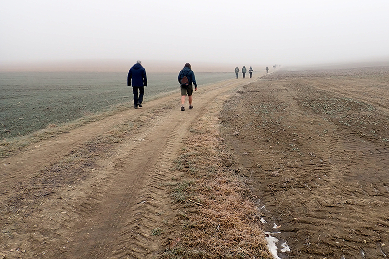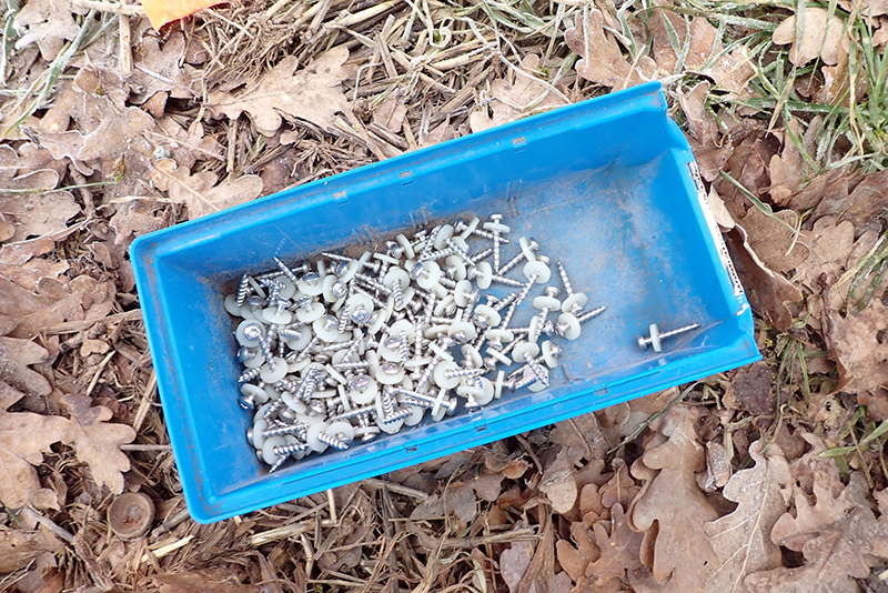 Die Strecke ist abwechslungsreich. Viele leichte Anstiege gilt es zu bewältigen. Wälder, Felder und kleinere Ortschaften werden durchlaufen. Jürgen und ich sind fasziniert. Immer wieder überholen wir die gleichen Wanderer, die sich auch immer wieder aufs Neue freuen, dass wir an ihnen vorbeilaufen. Offensichtlich machen wir längere Pausen als sie. Am Ende werde ich meine Uhr kontrollieren und feststellen müssen, dass wir insgesamt tatsächlich 90 Minuten Pause gemacht haben. Das kam mir jetzt wirklich nicht so vor. Die kürzeste, aber lustigste Pause haben wir auf einem Feldweg im Nirgendwo. Kurz zuvor hatte ich Jürgen noch von einer Selbstkontrolle erzählt, bei dem mir der Lautner Toni den Stempel auf die Karte gedrückt hat. Schon erreichen wir solch eine Selbstkontrolle und wir haben uns gleich selbst nicht mehr unter Kontrolle. Wer auf diese Idee kommen ist, hat vermutlich eine Schraube locker. Am Wegesrand steht eine blaue Plastikbox mit Schrauben und Beilagscheiben. Auf dem Hinweisschild steht, dass jeder Wanderer eine und wirklich nur eine Schraube entnehmen und im Ziel vorzeigen muss. Wir kriegen uns kaum noch ein. Wie kommt man auf eine solche Idee? Wir finden es genial und setzen unseren Weg fort.