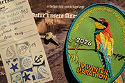 Die Naturwanderfreunde Haspelmoor haben sich bei den Aufnähern für wechselnde Tiermotive entschieden. In diesem Jahr ist der Aufnäher besonders farbenprächtig. Der Bienenfresser ist ein bunter Vogel, der sich, wie der Name schon sagt, von Bienen, Wespen, Hummeln und allem anderen was durch die Lüfte schwirrt, ernährt. Er galt in den 80‘er Jahren in Deutschland als ausgestorben, fand jedoch schon in den 90‘ern den Weg zurück und hat sich mittlerweile mit rund 6.000 Brutpaaren wieder etabliert. Der Bienenfresser durfte sich bereits zweimal mit dem Titel „Vogel des Jahres“ schmücken. Allerdings nicht in Deutschland. 2012 bekam er in Armenien und der Slowakei den Zuschlag. Vielleicht klappt es ja bei uns auch einmal. Ich drücke allen Bienenfressern jedenfalls den Daumen, auch wenn ich noch keinen persönlich getroffen habe.