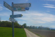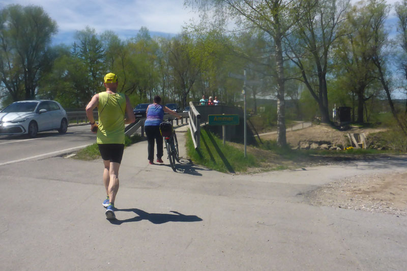 Die Dießener Straße wird nicht mehr gelaufen. An der Ammerbrücke nach Fischen biegen wir südwärts ab. Nach 900 Meter rechts abbiegen an der Beschilderung Radweg Raisting/Dießen (s. Streckenplan und Bilder).