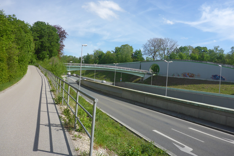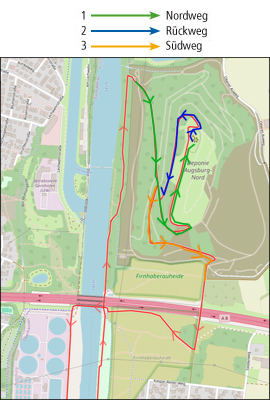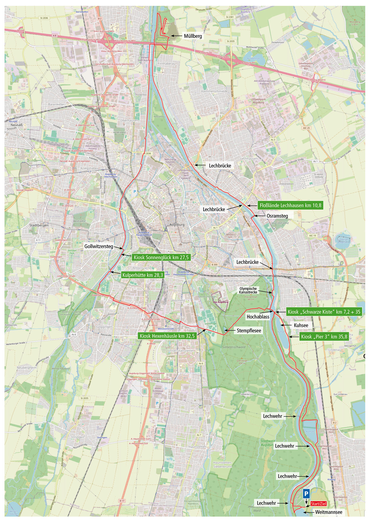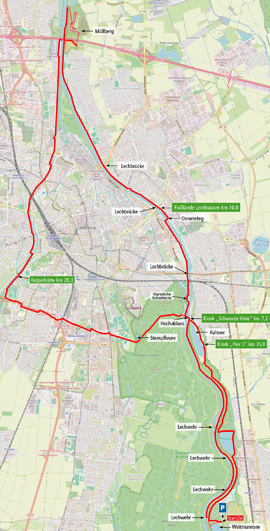 Start und Ziel sind vor dem Restaurant Seeblick am Weitmannsee Kissing. Am Lech entlang bis zum Hochablass und dort den Steg überqueren. Am Eiskanal entlang und weiter am Lech bis zum Osramsteg und wieder zurück auf die Lechostseite. Weiter bis zur Autobahnbrücke A8. Auf dem beschilderten Nordweg geht es auf den Gipfel des Müllbergs. Abwärts führt uns der Südweg zu einer Brücke über die A8. Unmittelbar danach, auf den Trail rechts halten und zurück bis zur roten Autobahnbrücke, diese wird jetzt überquert. Unmittelbar danach wieder nach links an den Lech und zum Zusammenfluß mit der Wertach. An der Wertach entlang bis zur Kulperhütte. Über Fuß- und Radwege an der B17, Messe, Sportanlage Süd und Siebentischwald geht es zurück an den Hochablass. Links am Kuhsee entlang bis zum Auensee. Ein Trail führt um den See, dann auf der Dammstraße zurück ins Ziel am Weitmannsee.